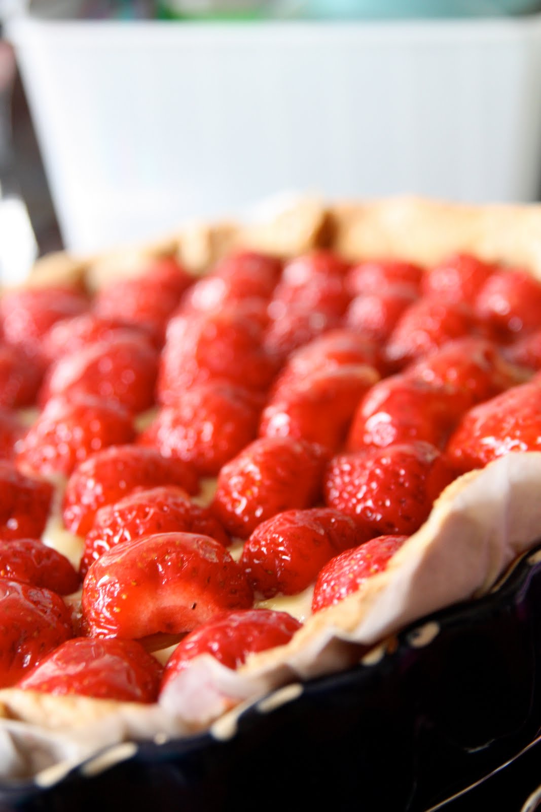 Battez les jaunes avec le sucre avec les graines de vanille jusqu’à blanchissement. Ajoutez farine et maïzena et mélangez bien. Faites chauffer le lait à feu doux avec la gousse coupées en deux et déjà débarrassée de ses graines, lorsqu’il “fume” versez tout doucement sur les oeufs et fouettez doucement pour incorporer le tout, puis remettre dans la casserole à feu fort et fouettez sans cesse jusqu’à épaississement souhaité, retirez du feu, versez sur votre fond de pâte sablée cuite à blanc et déposez dessus un film alimentaire, en contact avec la crème afin qu’elle ne forme pas de “croûte”. Laissez refroidir. Puis déposez les fraises et faites chauffer du jus de poire avec de l’agar-agar (25CL – 1 g) et nappez les fraises à l’aide d’un pinceau, laissez prendre au frigo.