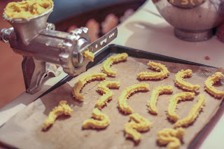 Remplir une poche à douille cannelée (ou le réservoir de votre hachoir) de pâte et former des S ou des bâtonnets avec la pâte. Déposez-les sur une plaque recouverte de papier sulfurisé. Laisser reposer une heure dans un endroit frais.