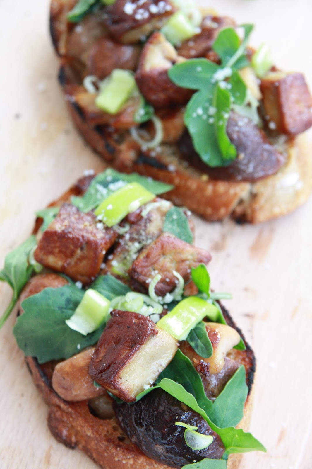 Assemblez vos bruschetta : déposer des cèpes coupés sur les tranches de pain grillé, puis des feuilles de roquettes, le reste de l’oignon émincé, les cubes de foie gras et enfin quelques tranches de poivron vert. Salez à la fleur de sel.