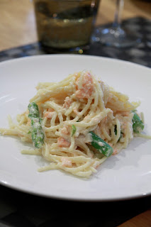 Spaghettis printaniers, asperges vertes et saumon