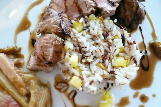 Médaillon de porc rôti et confit de rhubarbe, jus de viande au vinaigre de framboise