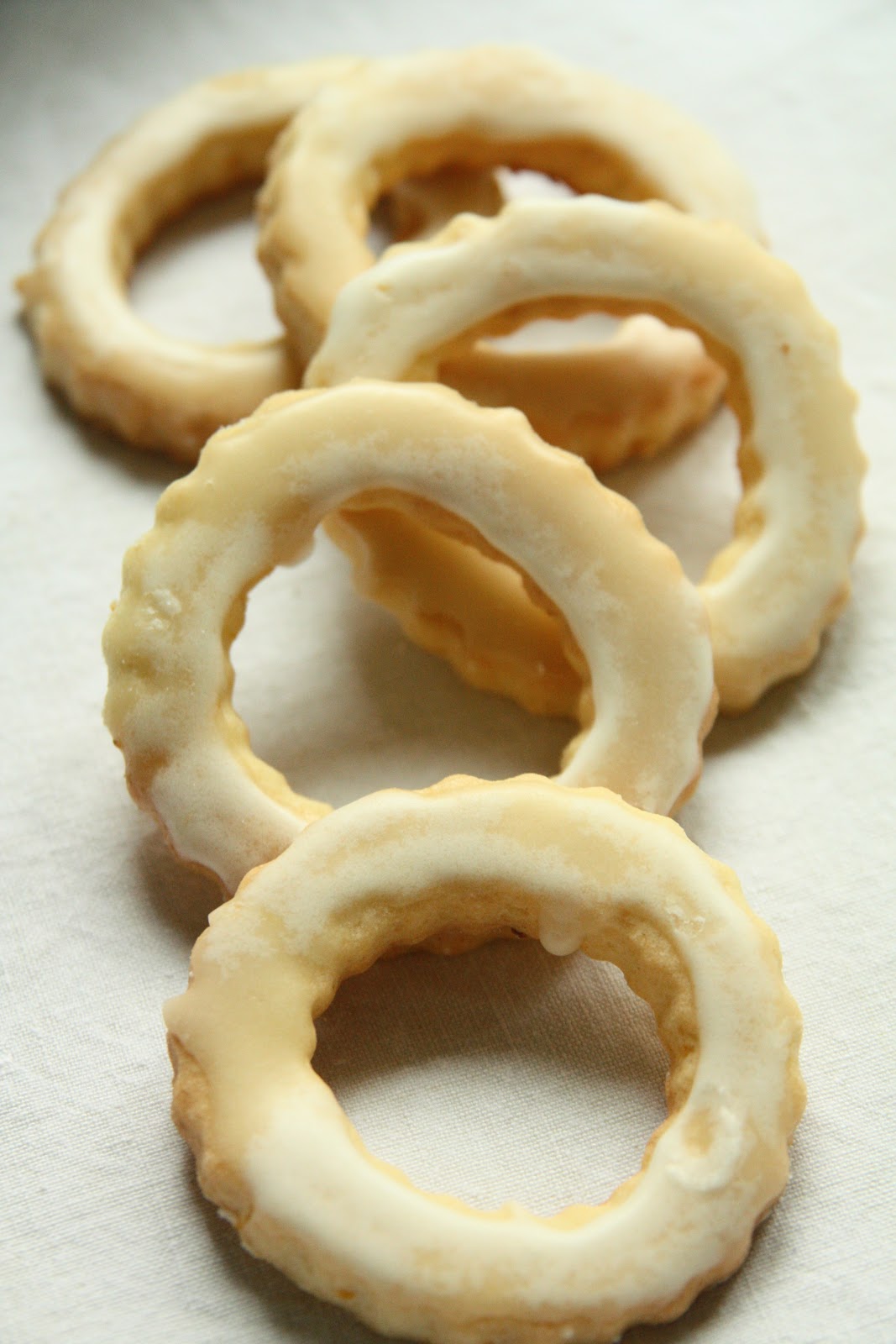 Faire une abaisse de 5 mm d’épaisseur et découper des ronds à l’aide d’un verre ou un emporte-pièce. Avec un dé à coudre ou un emporte-pièce plus petit, découper le centre de façon à obtenir des anneaux. Poser ces anneaux sur une plaque beurrée et farinée et faire cuire à 200°C pendant 12 minutes environ. Glacer encore chaud.