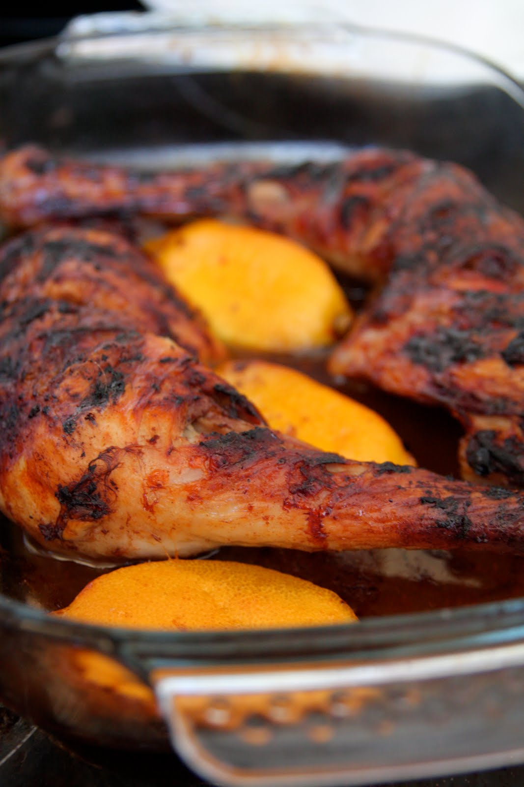 Retirer les cuisses de poulet de la marinade en ayant soin de réserver cette dernière. Sécher légèrement les cuisses de poulet avec du papier absorbant et les disposer dans un plat à four. Ajouter les quartiers de citrons.