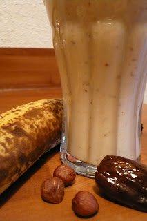 C’est simple, on coupe la banane en tronçons, on ajoute les dattes, le yaourt, le jus de pomme et les noisettes et on mixe !