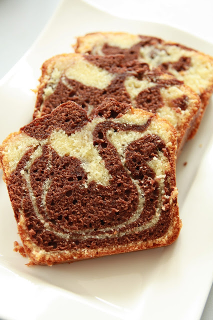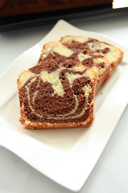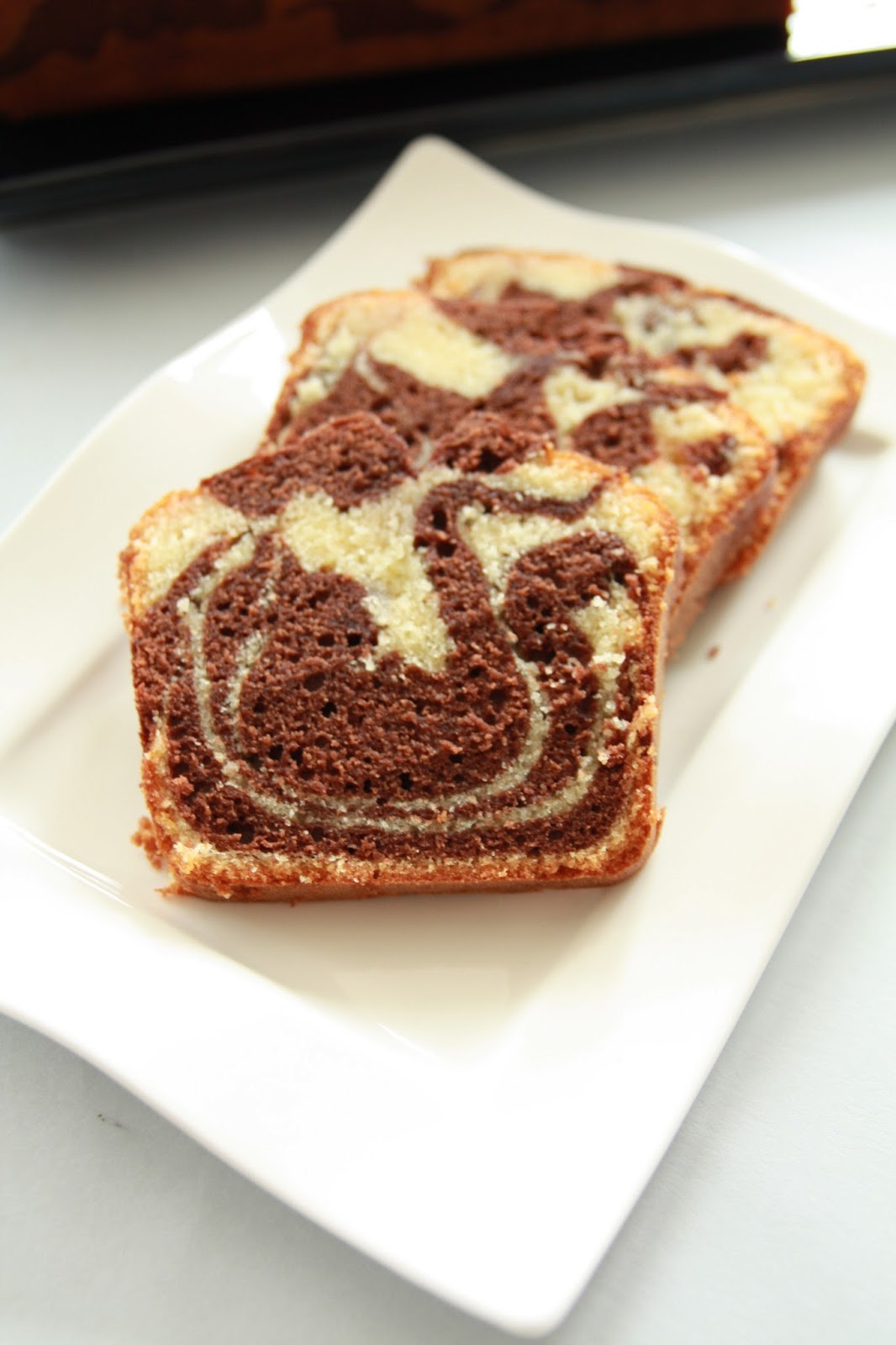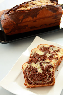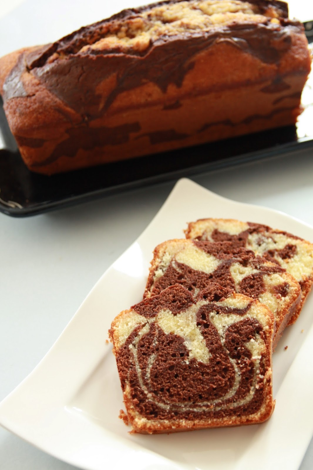 Versez un tiers de la pâte à la vanille dans le moule à cake. Ajoutez la moitié de la pâte au chocolat. Ajoutez un tiers de la pâte à la vanille, puis le reste de la pâte au chocolat et versez enfin le reste de la pâte à la vanille.