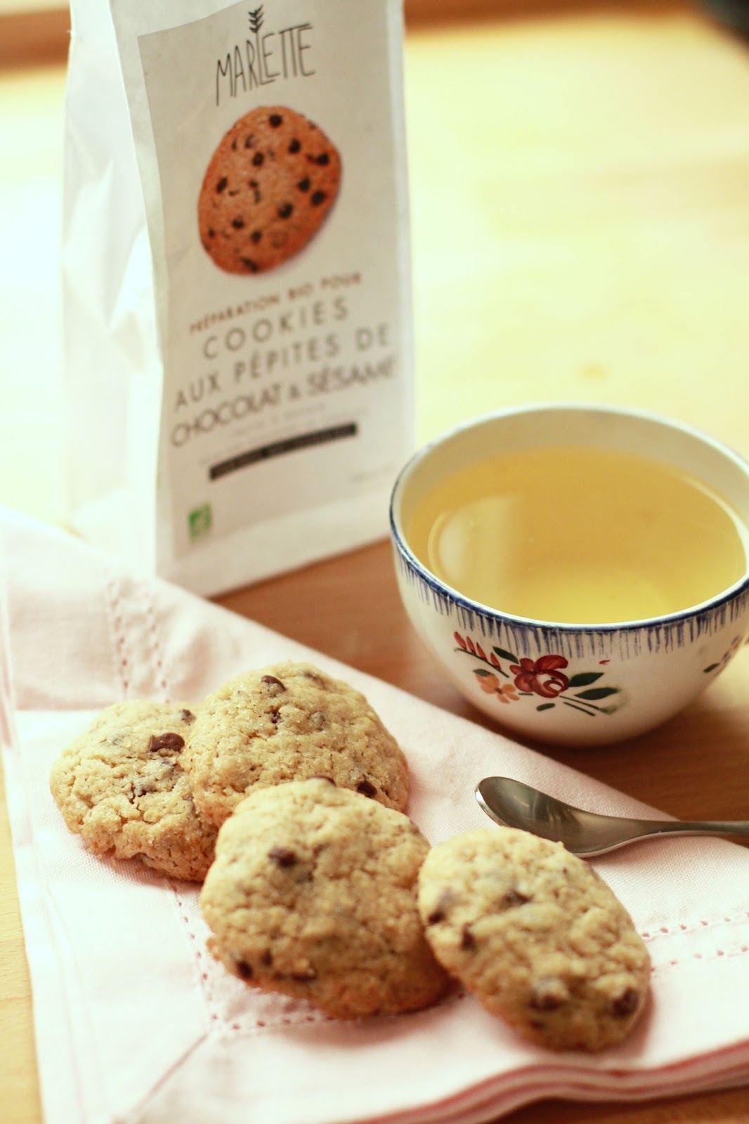 J’ai choisi de vous montrer le résultat des cookies au sésame et pépites de chocolat. De beaux cookies bien formés, dorés et moelleux à coeur.