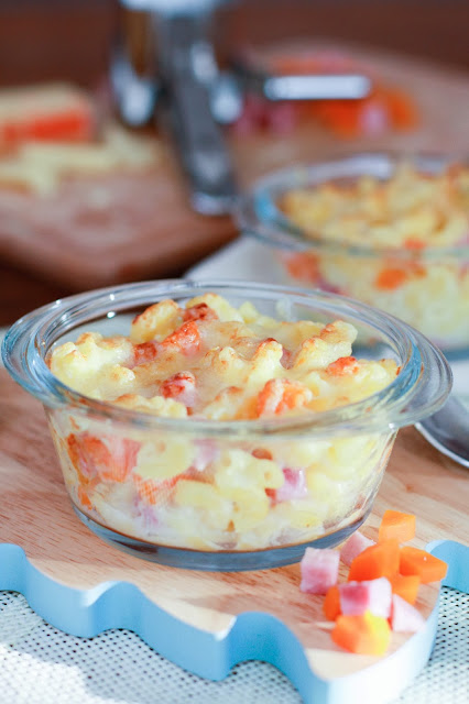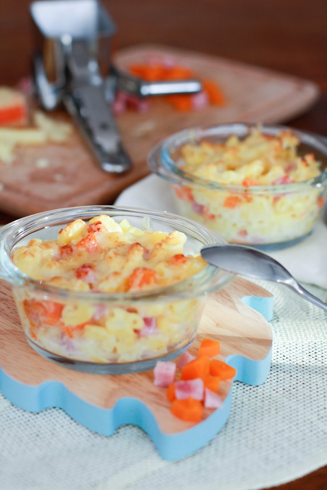 Allumer le four à 200°C. Mélanger les pâtes et la béchamel avec la carotte cuite coupée en petits dés. Ajouter le jambon et verser dans le plat à gratin. Saupoudrer du reste d’emmenthal râpé et faire gratiner au four pendant 20-25 minutes.