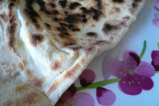 (Instruction à suivre pour la vache qui rit. En ce qui concerne le Tresana, je l’ai directement étalé sur le disque du naan avant de le replier.)