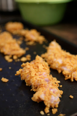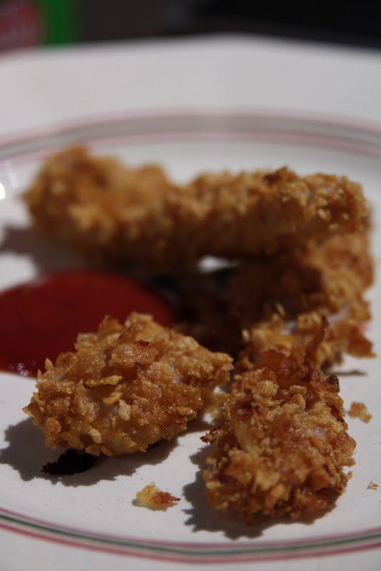 Egouttez vos aiguillettes, les passer dans les Corn Flakes grossièrement écrasés.