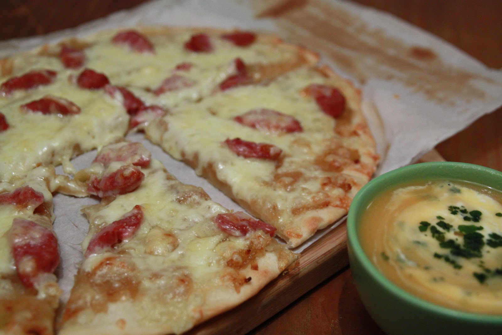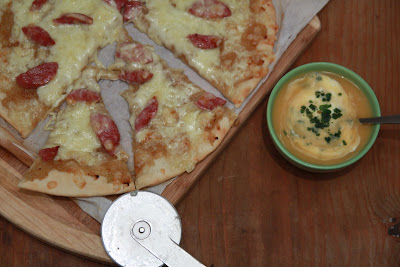 Etalez la pâte à pain sur une épaisseur d’un demi centimètre, disposer-y les oignons, puis la Tomme de Savoie râpée et enfin les tranches de diot.