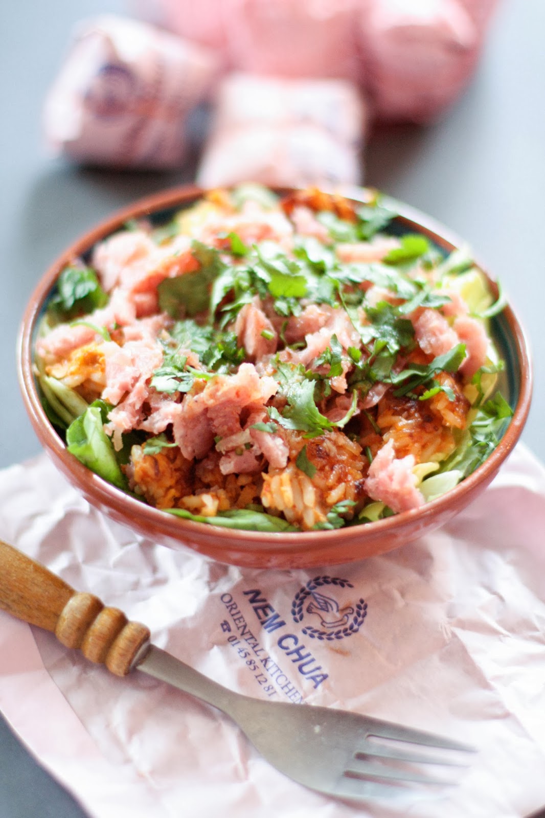 Quand les boules de riz sont froides, émiettez-les à la main et placer le tout dans un saladier avec le nem chua qui aura aussi été effiloché à la main (penser à enlever éventuellement la feuille verte, l’ail et le piment à l’intérieur!), l’oignon vert et une partie des herbes aromatiques selon votre goût que vous aurez hachées.