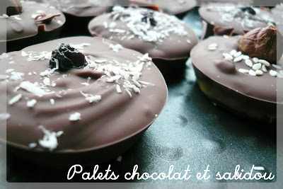 Comme d’habitude tu m’intrigues avec tes ingrédients mystère comme le salidou…je vais de ce pas demander à Wiki ce qu’il en pense ! Je ne suis pas fan de coco mais tes palets au chocolat me font de l’oeil !