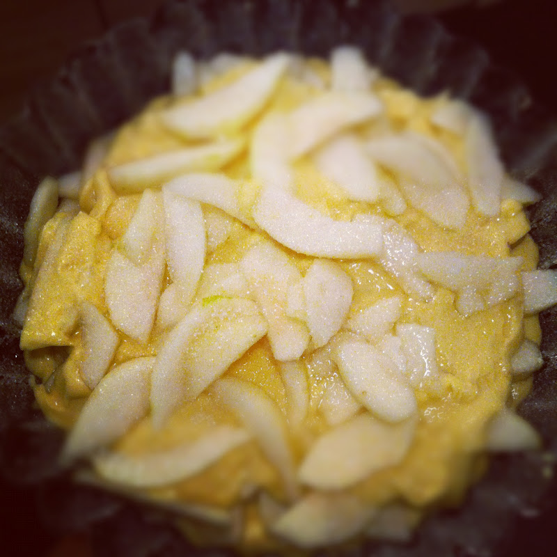 Peler et couper les pommes ou les poires en fines tranches. Les mettre dans une terrine et les rouler dans le sucre. Les laisser reposer pendant que l’on prépare le gâteau.
