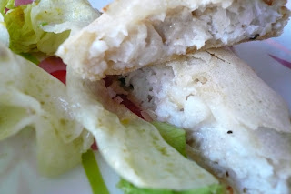 (J’ai accompagné ces triangles de salade iceberg à la vinaigrette huile de pépins de courge+vinaigre de framboises)