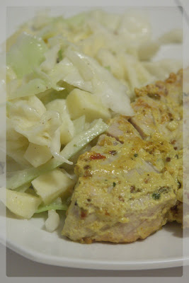 Pendant ce temps, préparez la salade.Détaillez le chou en fines lamelles (râté pour moi, je n’ai pas “encore” de mandoline) et la pommes en petits cubes. Ajoutez les ingrédients de la vinaigrette et bien mélanger, gardez au frais.