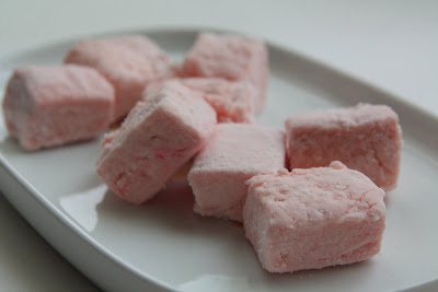 Lorsque la guimauve est prise, sortez-la du moule, retirez le papier et coupez-la en gros cubes à l’aide d’un couteau préalablement trempé dans de l’eau chaude.