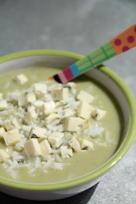 Versez du velouté dans chaque bol, ajouter du riz blanc et quelques dès de fourme.